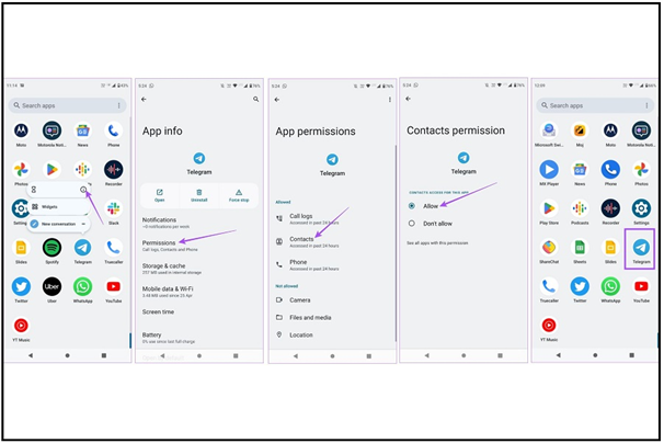 در تلفنهای اندرویدی باید آیکون تلگرام را انتخاب کنید و برای چند لحظه فشار دهید تا وارد بخش App Info شوید. در اینجا با ورود به بخش مجوزها و سپس انتخاب گزینه مخاطبین میتوان اجازه دسترسی را بدهید. در پایان با خروج از تنظیمات و ورود به اپلیکیشن میتوان از حل شدن خطا مطمئن شد.