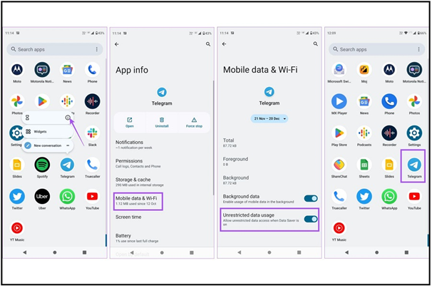 حتما از اتصال تلفن همراه با اینترنت پرسرعت مطمئن شوید. اگر تلفن شما اندرویدی است پیشنهاد میکنیم گزینه Unrestricted Data Usage را در حالت Data Saver برای تلگرام فعال کنید. برای این منظور باید آیکون تلگرام را فشار دهید و وارد App Info شوید. در ادامه گزینه Mobile Data and Wi-Fi را انتخاب کنید و گزینه Unristricted data usage را فعال کنید.