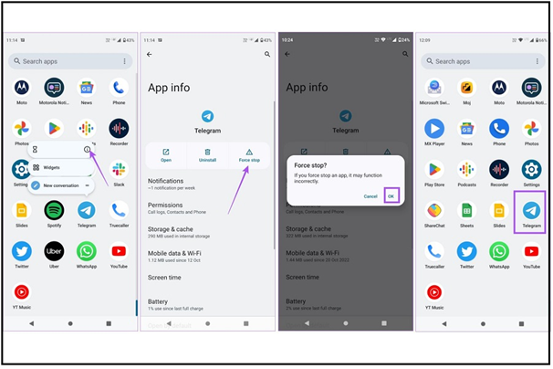 در گوشیهای اندرویدی باید آیکون تلگرام را فشار دهید و وارد App Info شوید. در ادامه گزینه "توقف اجباری" را انتخاب کنید و تایید کنید. سپس پنجره App Info را ببندید و حل شدن یا نشدن خطای همگام سازی در نلگرام را چک کنید.