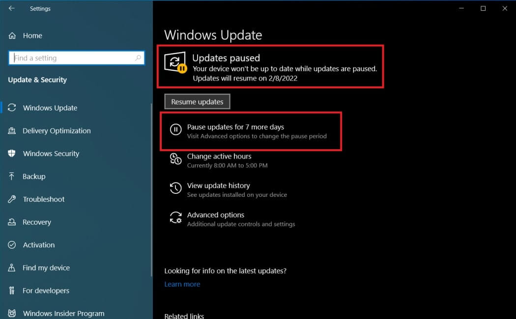 - به تعویق انداختن بهروزرسانیها (Pause Updates): میتوانید بهروزرسانیها را تا 35 روز به تعویق بیندازید. این قابلیت زمانی مفید است که به یک اتصال اینترنت محدود دسترسی دارید یا میخواهید از دانلود بهروزرسانیهای حجیم در زمانهای خاص جلوگیری کنید. برای این کار، به Settings > Windows Update بروید و گزینه Pause updates را انتخاب کنید.