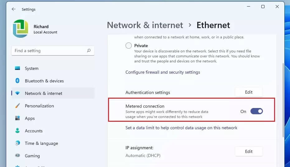- دانلود بهروزرسانیها از طریق Metered Connection: اگر از یک اتصال اینترنت محدود (مانند اینترنت همراه) استفاده میکنید، میتوانید آن را به عنوان یک "Metered Connection" تنظیم کنید. در این حالت، ویندوز از دانلود خودکار بهروزرسانیهای بزرگ خودداری میکند. به Settings > Network & internet > Wi-Fi/Ethernet بروید، شبکه مورد نظر را انتخاب کنید و گزینه Metered connection را فعال کنید.