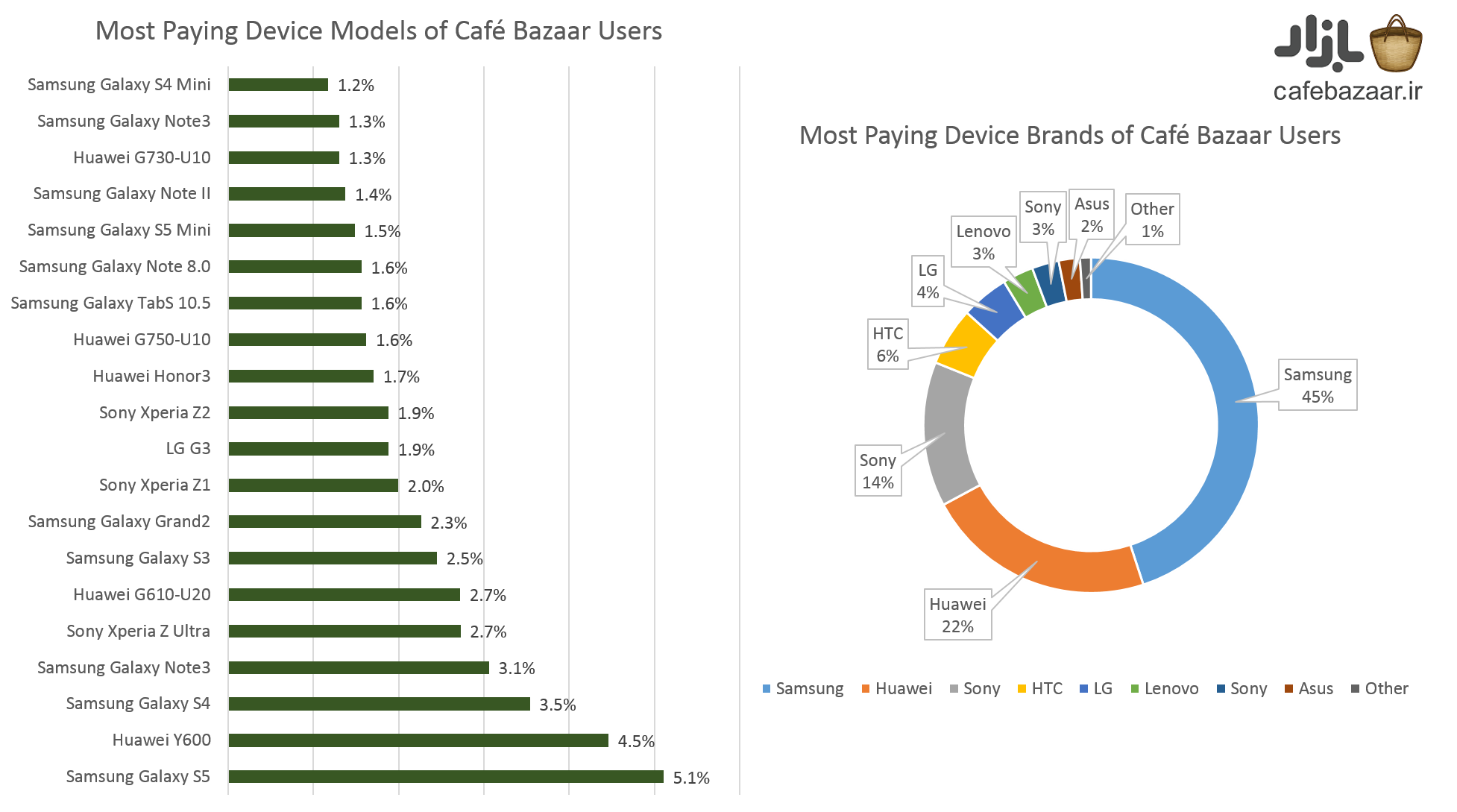 جالب اینکه در مجموع، اکثر کاربران کافه بازار از محصولات سامسونگ استفاده می کنند. این شرکت کره ای با ۴۲ درصد، بیشترین سهم بازار را در میان کاربران ایرانی دارا است و پس از آن هوآوی با ۲۹ درصد و سونی با ۱۴ درصد در رتبه های بعدی قرار دارند.