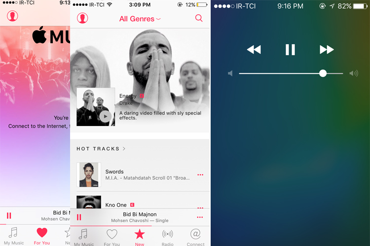 اولین باری که وارد اپلیکیشن موزیک شدیم، طراحی جدید آن توجهمان را به خودش جلب کرد. اپلیکیشن موزیک تا حد زیادی باز طراحی شده و البته تجربهی بسیار سریعتر و راونتر و البته هوشمندتری را از پخش موسیقی در اختیارتان قرار میدهد. امکان پخش سریع موسیقی با کمک دکمه پلی/پاوس بر روی آیکون هر آهنگ در بخش موسیقیها و امکان لایک کردن موسیقیها و همچنین طراحی ظاهری که به نرمافزار آیتونز بیش از پیش نزدیک شده است، سبب میشود تا اپلیکیشن موزیک را هوشمندتر و سریعترین نسخهی این نرمافزار در بین نسخههای مختلف iOS بدانیم. در بخش آلبومها، طراحی به صورت کامل تغییر کرده و به طراحی نرم افزار آیتونز نزدیک شده است. شما با رفتن به هر آلبوم یا نام خواننده، به لیست آهنگها دسترسی خواهید داشت. همچنین با لایک کردن یک موسیقی یا گوش کردن به آن می توانید اپل را از سلیقه خود برای پیشنهاد موسیقی آگاه کنید. از سوی دیگر تبهای دیگری که قبلا در اپلیکیشن موزیک دیده میشد، جای خود را به تبهای جدیدی از سرویس اپل موزیک دادهاند تا هر چه بیشتر توجه شما را به سمت استفاده از این سرویس جلب نمایند. اما این تمامی ویژگیهایی نیست که اپلیکیشن موزیک با خود به همراه دارد. از سوی دیگر اضافه شدن سرویس اختصاصی اپل موزیک به این دستگاه و معرفی هوشمند موسیقیهایی که همرده و همسطح موزیکهای شما هستند و همچنین دسترسی به آرشیو بیش از هزاران موسیقی با قیمتی نه چندان زیاد، موضوعی است که از آن نمیتوان به سادگی رد شد. به هر حال یکی از برترین بخشهایی که در iOS 9 با آن مواجه خواهید شد، سرویس جدید اپل موزیک است که البته هر چند سه ماه استفاده از آن به صورت آزمایشی رایگان است، ولی برای اکانتهایی که کردیت کارت در آنها ثبت نشده، ناچار به پرداخت یک گیفت کارت حداقل 10 دلاری(معادل مبلغ ماهانه سرویس بعد از 3 ماه) هستید. هر چند این گیفت کارت تا انتهای دوره آزمایشی مصرف نخواهد شد و بعد از آن هم میتوانید آن را پیش خود نگاه دارید، ولی به هر صورت اپل قوانین سختگیرانهای را در این باره وضع کرده است.