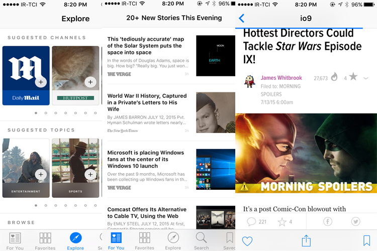 یکی دیگراز اپلیکیشن های مهمی که در iOS 9 میهمان آی دیوایس شما خواهد بود، اپلیکیشن خبرخوان اختصاصی اپل است. هر چند این سرویس شباهت بسیاری با اپلیکیشنهای معروف این رده همچون flippboard دارد، ولی اپل با قرار دادن این سرویس قدم بلندی را برای کشاندن کاربرانش از سوی این اپلیکیشنها به سرویسهای اختصاصی خودش برداشته است. در نسخهی آزمایشی، این اپلیکیشن هنوز در نسخه بتاقرار داشت و چندان تجربه رضایت بخشی از آن مشاهده نکردیم. ولی در کل امکانات قابل قبول و خوبی دارد که میتواند شما را برای خواندن خبرها مجاب کند. در اولین استفاده، اپلیکیشن News از شما میخواهد تا بنگاههای خبری و اطلاعاتی دلخواهتان را انتخاب کنید و در مرحلهی بعد موضوعاتی که مورد علاقهی شماست را نیز از شما سوال میکند. سپس در قالب مجلهی خبری تمامی این اطلاعات را به شما نمایش خواهد داد. قالب نمایش اخبار در این اپلیکیشن با فرمت اختصاصی اپل است و بنگاههای خبری بزرگ برای همکاری مستقیم با اپل برای ایجاد و ارائهی مطالبشان در این اپلیکیشن وارد همکاری شدهاند. رد پای هوشمندسازی سیستمعامل را در این اپلیکیشن نیز می توان جستجو نمود. در واقع اپل با بررسی مطالبی که شما بیشتر مطالعه میکنید، سعی میکند تا چینش و ارائهی اخبار را مطابق سلیقه شما انجام دهد. همچنین تگهایی که اپل بر روی اخبار وارد میکند کمک میکند تا به سرعت بتوانید اخبار مرتبط را از بنگاههای خبری مختلف دنبال نمایید. نکتهی قابل توجه دیگر در این زمینه حذف اپلیکیشن NewsStand و جایگزینی آن با اپلیکیشن News است. بدین ترتیب روزنامهها و مجلات موجود در فروشگاه برنامه اپل به صورت یک اپلیکیشن جداگانه نصب خواهند شد و دیگر در زیرشاخهی اپلیکیشن NewsStand قرار نمیگیرند. هر چند در استفادهی ما از این اپلیکیشن بسیاری از این موارد چندان قابل اجرا یا کامل نبود و دلیل آن هم طبیعتا آزمایشی بودن و در دست توسعه بودن این اپلیکیشن است. امیدواریم درنسخهی نهایی شاهد تغییرات بیشتری در عملکرد این اپلیکیشن باشیم. مرورگر Safari یکی از مهمترین تغییراتی که در مرورگر سافاری قابل مشاهده بود، امکان تبدیل کردن تمامی صفحات به فایل PDF و ذخیره در iBooks بود که سبب میشود بتوانید نسخه PDF شده از سایتهایتان را بعدا و به صورت آفلاین مطالعه کنید که خصوصا برای ما ایرانیها که چندان قصد استفاده از اینترنت دستگاهمان را نداریم ویژگی بسیار قابل توجهی است.