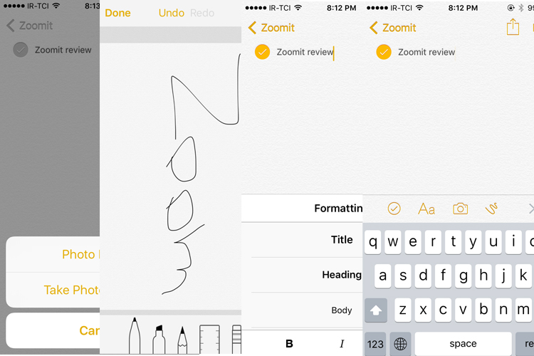 یکی از تغییرات بزرگ و قابل توجه در بروزرسانی جدید iOS در اپلیکیشن Notes صورت پذیرفته است. این اپلیکیشن حالا با نسخهی ساده و با امکانات اندک قبلی تفاوتهای بسیاری دارد و میتوان آن را مشابه نمونههای معروفی همچون ever Note یا نرمافزارهای همرده آن محسوب کرد. در این اپلیکیشن میتوانید یادداشتهای خود را در پوشههای مختلف دستهبندی کنید، بدانها فایل و عکس پیوست کنید و همچنین با دست نوتهای سریع بکشید. در کل اپلیکیشن نوت نشان میدهد که دیگر ویژگی سادگی محض در سیستمعامل اپل جوابگو نیست و قرار است سهولت استفاده همراه با قابلیتهای اساسی بیشتر همراه شود.