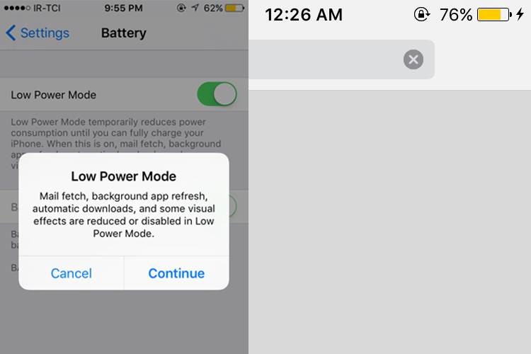 علاوه بر بهبودهایی که در مصرف بهینهتر باتری در iOS 9 صورت گرفته است، یک قابلیت مهم که تا پیش از این در تلفنهای اندرویدی مورد استفاده قرار گرفته بود و از قضا بسیار هم مورد پسند کاربران این سیستمعامل بود، به این نسخه اضافه شده است و آن هم چیزی نیست جز قابلیت Low Power Mode ! این قابلیت درست در زمانهایی که شارژ دستگاه شما کم است و دسترسی به شارژر ندارید به کمکتان میآید و دستگاه شما را برای حداقل نگه داشتن سه ساعت شارژ بیشتر تنظیم میکند. در استفادهی ما از این قابلیت، تاثیر این حالت بر روی شارژ دستگاه به وضوح قابل مشاهده بود. شیوهی کار نیز بدین صورت است که دستگاه با حذف یا غیرفعال کردن یک سری از قابلیتها همچون ریفرش منظم اپلیکیشنهای مختلف یا غیرفعال کردن انیمیشنها، مدت زمان بیشتری را برای شما فراهم میکند. البته ممکن است در این حالت در استفاده از برخی اپلیکیشنها با کندی محسوسی مواجه شوید که آن هم احتمالا ناشی از کم شدن قدرت پردازشگر در این حالت است. به هر حال اضافهشدن این قابلیت نکته مهم و حیاتی بود که یک قدم رو به جلو برای اپل محسوب میشود.