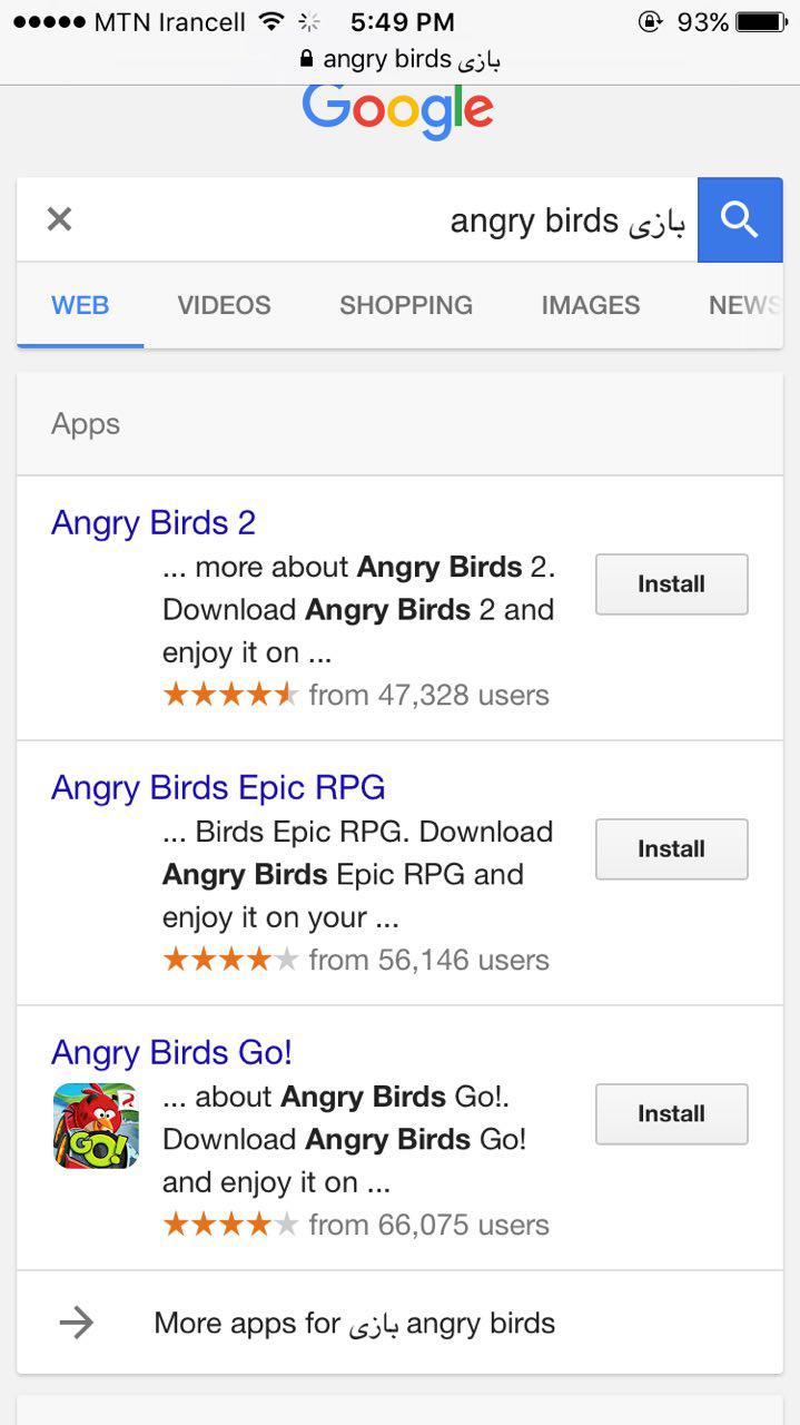برای مثال با جستجو : بازی angry birds لینک های اول نتیجه مربوط به اپ استور بوده و با کلیک بر روی آن به راحتی به اپ استور منتقل خواهید شد. این قابلیت بسیار مفید بوده و کاربران برای پیدا کردن برنامه های مورد نظر خود با مشکلات کمتری مواجه خواهند شد.