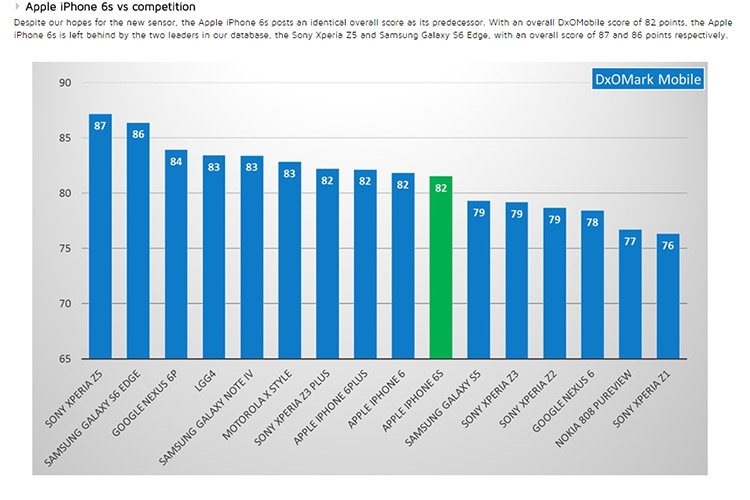 در این لیست همانطور که مشاهده میکنید گوشی های اکسپریا زد 5 ،گکسی اس 6 اج، نکسوس 6پی، ال جی جی 4، نوت 4 و همچنین موتورولا ایکس نیز از آیفون 6 اس جلوتر بوده و نمرات بالاتری کسب کرده اند. همچنین این تیم اعلام کرده است که دوربین آیفون 6 اس به لطف فوکوس خودکار سریع، رنگ بندی و تراز سفید عالی، اکسپوژر قدرتمند و همچنین رندر دقیق رنگ ها در شرایط نوری ضعیف به کاربر قدرت ثبت عکس های با کیفیت و قوی را خواهد داد اما برخی نویز ها در تصاویر ثبت شده در شرایط نوری ضعیف و همچنین سایه افتادن بر روی رنگ ها در فضای بسته باعث گرفتن این نمره شده. لازم به ذکر است که در مورد ویدئو های گرفته شده با این دوربین از کیفیت بالا و قابل قبولی برخوردار است.