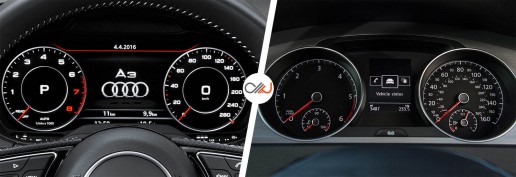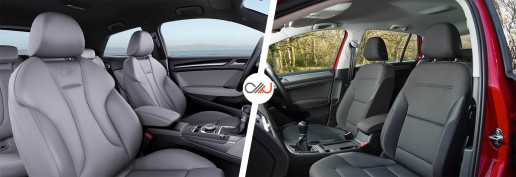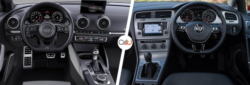 اگر بخواهیم یک قسمت از آئودی A3 را که تقریباً همهٔ دنیا آن را عالی میدانند نام ببریم قطعاً کابین است چراکه چنین طراحی و کیفیتی فقط در خودروهای بسیار گرانقیمتتر یافت میشود. بهکارگیری فناوریهای پیشرفتهای چون صفحهنمایش فوقالعاده، سیستم دیجیتالی نمایشگر آمپر و شارژ بیسیم تلفن همراه در کابین A3 نیز بر صحت این موضوع تأکید دارد؛ اما گلف هم در این زمینه چندان دستوپابسته نیست و هنگامیکه با آن را رقبای مستقیمش مقایسه میکنیم کاملاً مشخص میشود که یک گام بزرگ درزمینهٔ کیفیت از آنها جلوتر است. کیفیت ساخت کابین گلف بهقدری بالاست که آن را کاملاً در حد و اندازهٔ کابین A3 قرار میدهد؛ اما در اینجا هم مشکل طراحی خارجی یعنی سادگیِ زیاد به چشم میخورد. بااینوجود هر دو خودرو راحتی بسیار عالی و آرگونومی فوقالعادهای را ارائه میکنند.
